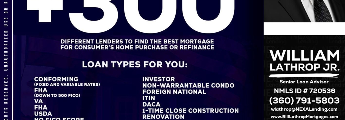 Hi, my name is Bill Lathrop. I’m a Loan Officer with NEXA Lending LLC., offering personalized mortgage solutions, fast customized quotes, great rates and service with integrity.