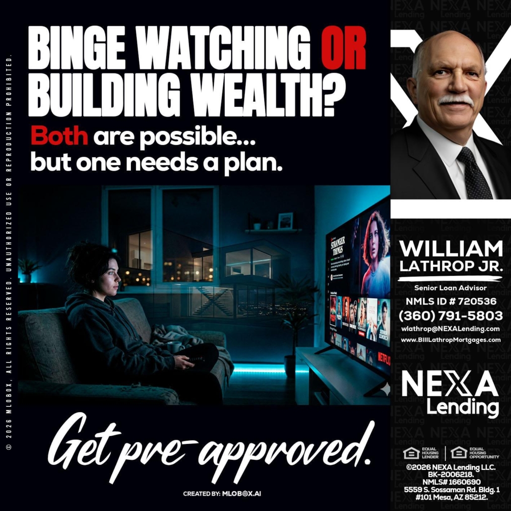 BINGE WATCHING - Bill Lathrop -Senior Loan AdvisorHi, my name is Bill Lathrop. I’m a Loan Officer with NEXA Lending LLC., offering personalized mortgage solutions, fast customized quotes, great rates and service with integrity.